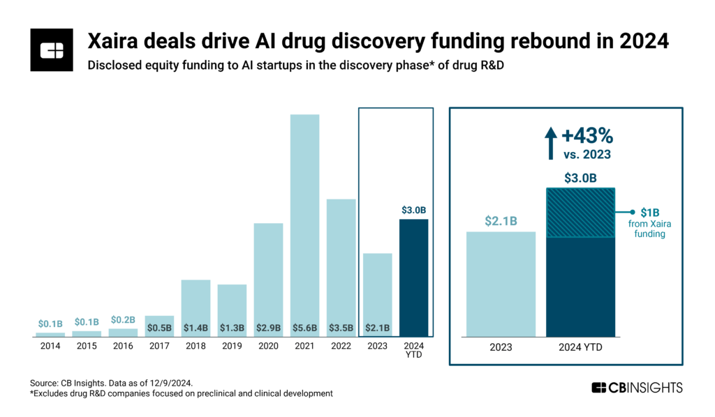 - Biologics developers using AI have secured $1.6B in 2024 — more than double 2023 funding — dominated by Xaira Therapeutics’ $1B raise. The focus on biologics signals that AI capabilities are broadening from their foundation in small molecules to include larger and more computationally complex therapeutics.