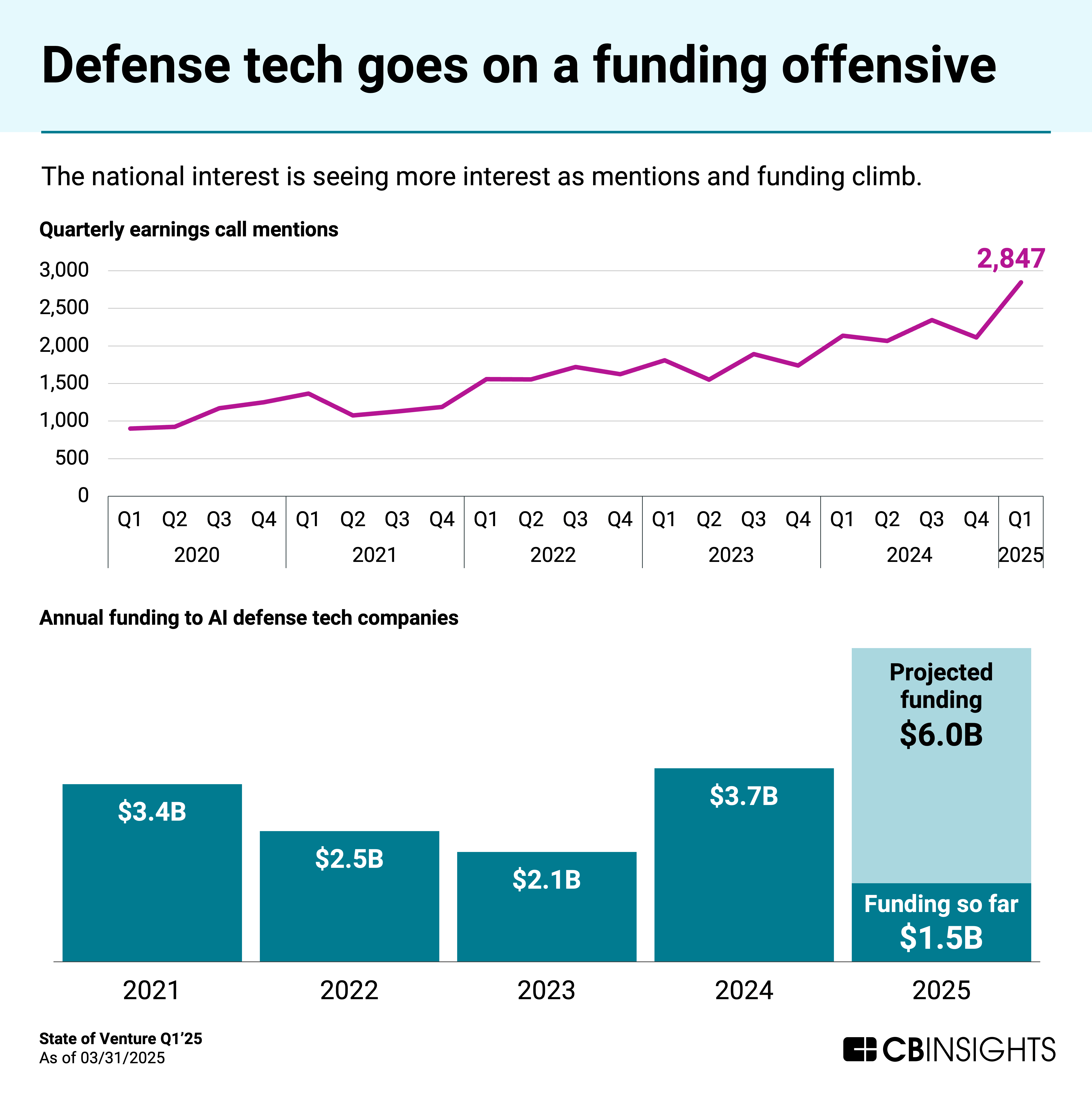 Funding to AI defense tech startups has already reached $1.5B this year — leading to a projected $6B by year-end. Last quarter saw earnings call discussion of defense reach an all-time high.