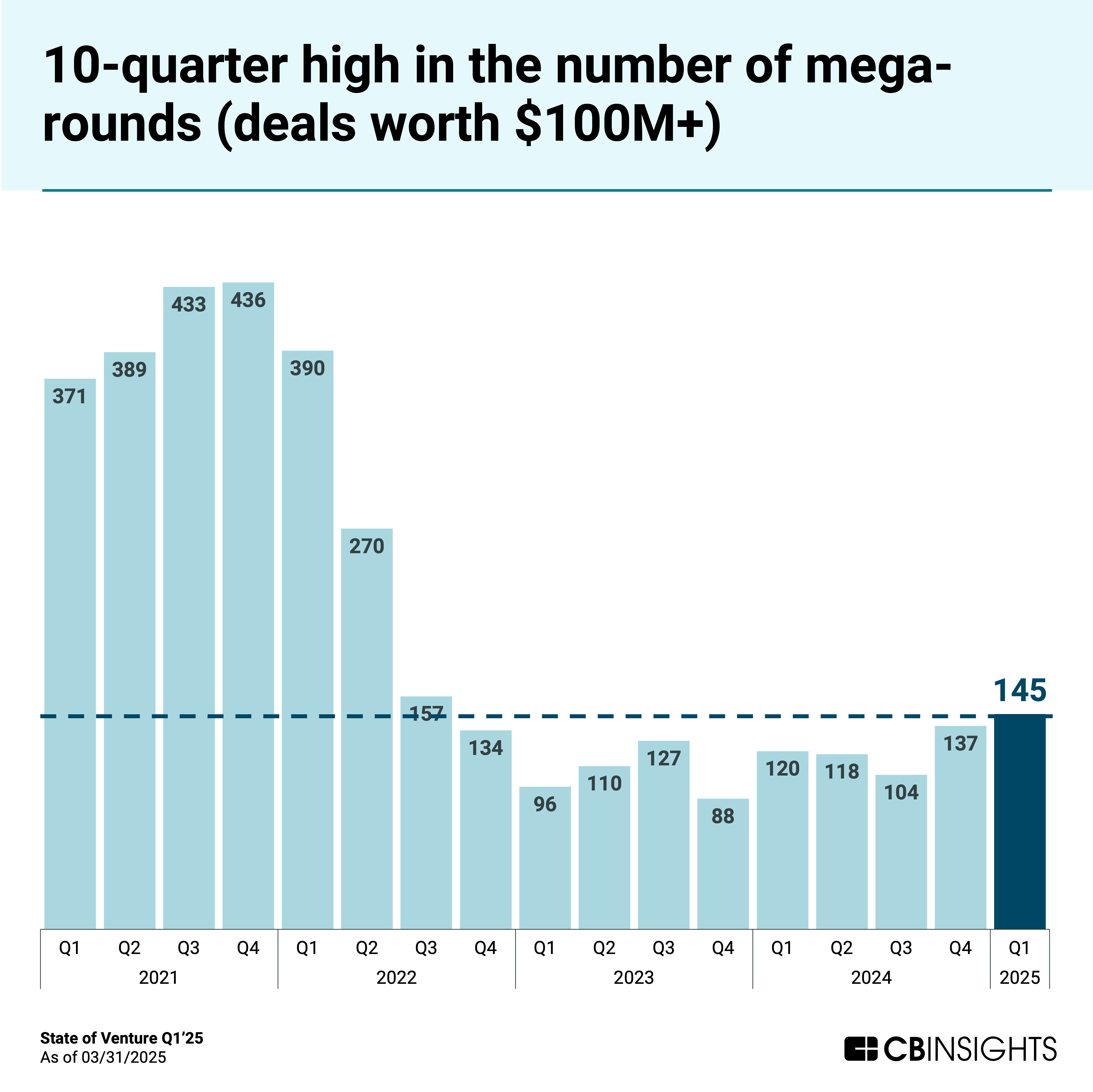 Mega-rounds (deals worth $100M+) accounted for 70% of all funding this quarter, up from 60% in Q4’24. A total of 145 mega-rounds closed in Q1’25 — the highest quarterly total since Q3’22, which saw 157.