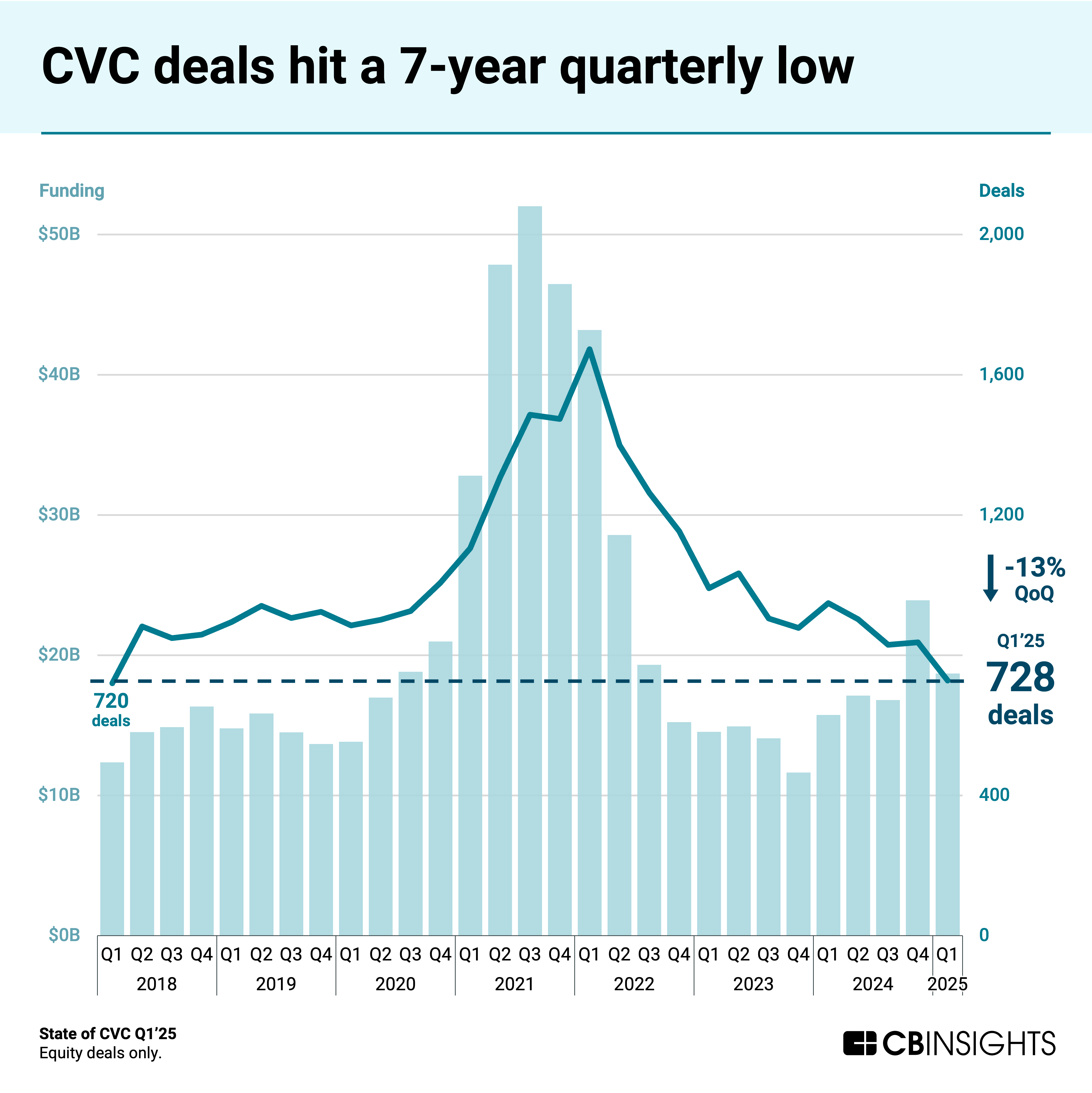 In Q1’25, corporate venture capital hit its lowest deal volume in 7 years, with transactions plummeting to 728 deals and CVC-backed funding dropping 22% QoQ to $18.7B.