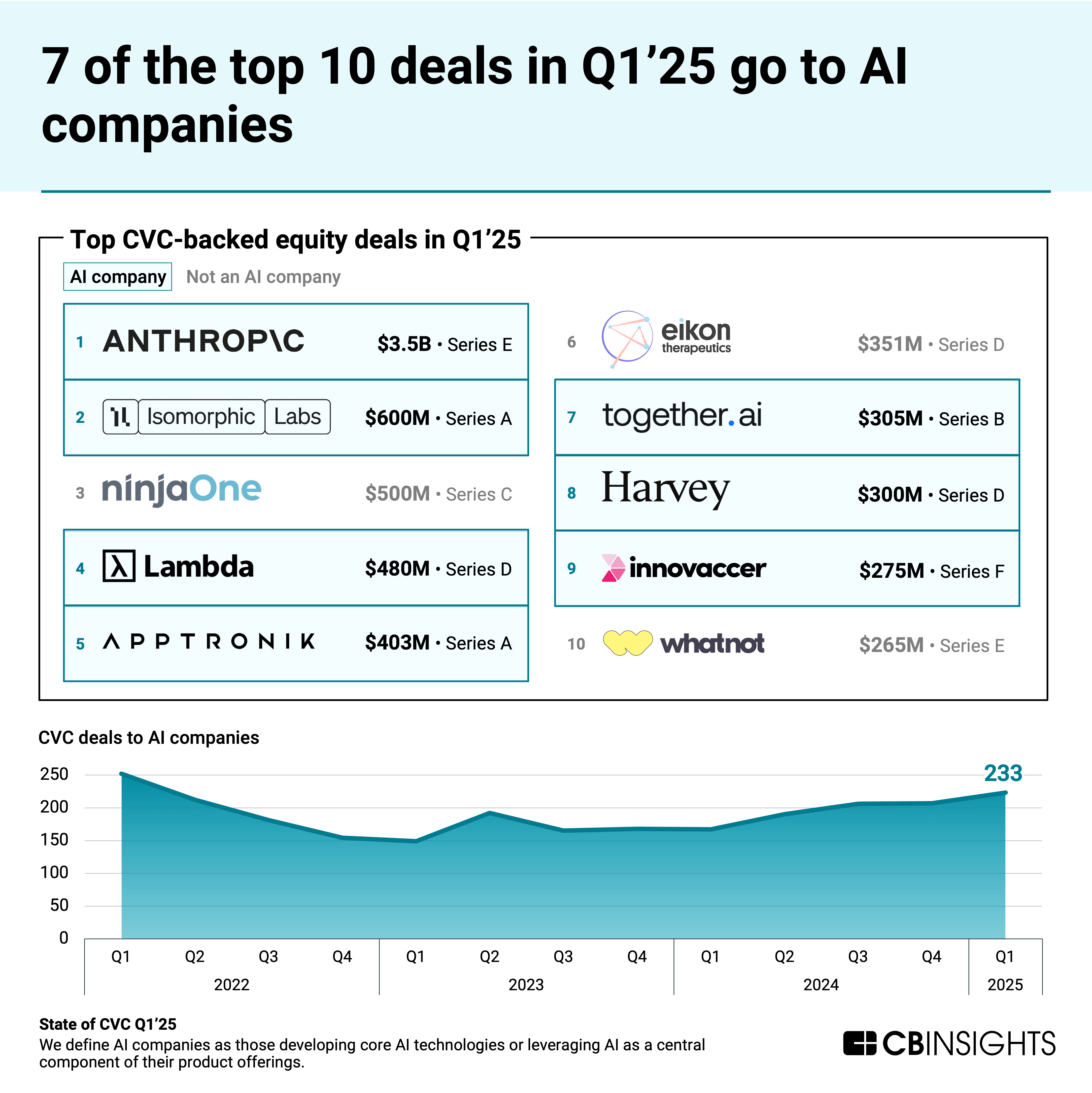 AI dominated the biggest CVC investments in Q1’25 — securing 7 of the top 10 deals — as CVCs place massive bets on startups with the potential to reshape industries.