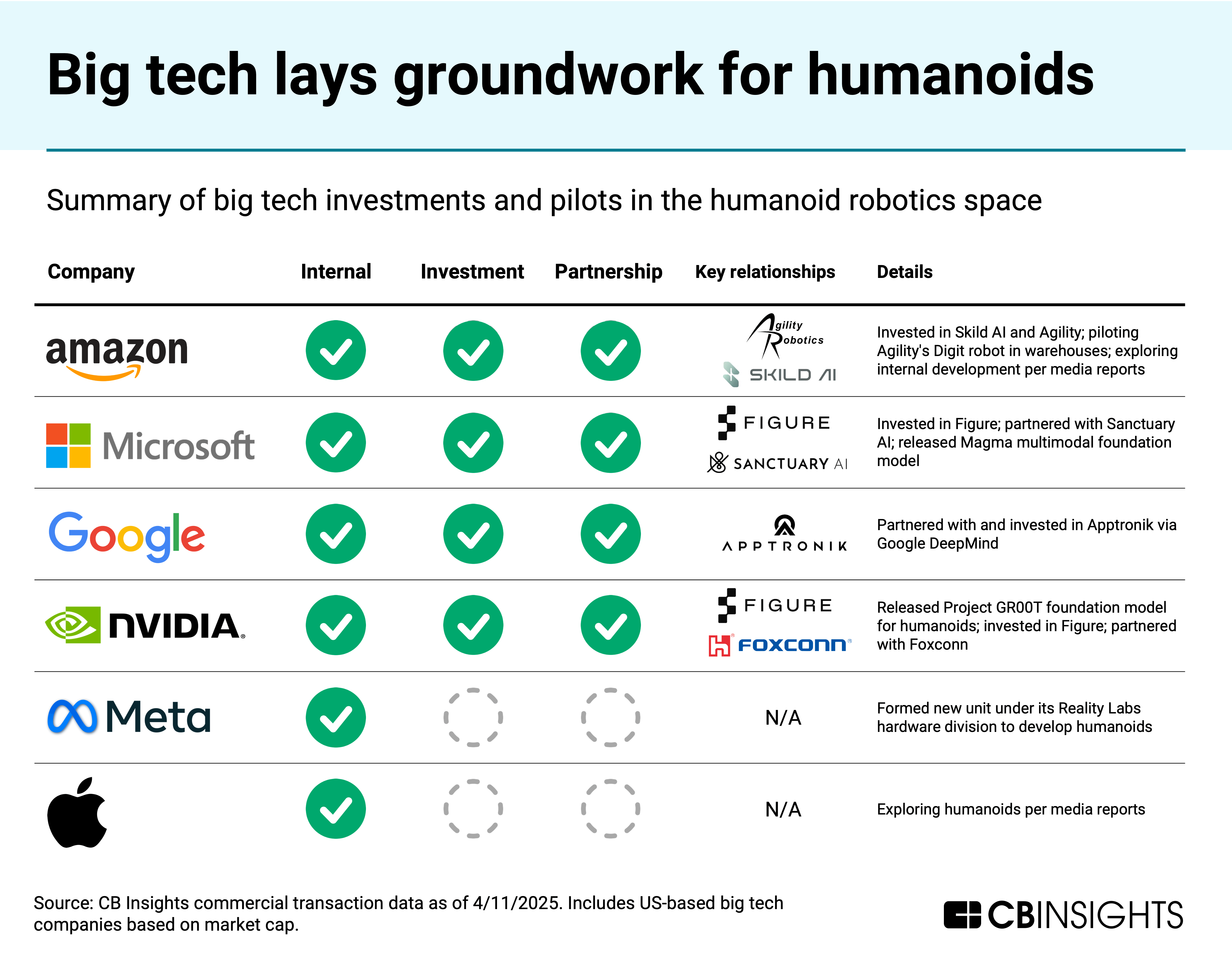 In February 2025, for example, Google joined Apptronik’s $403M Series A funding round while Meta formed a new unit under its Reality Labs hardware division to develop humanoids.