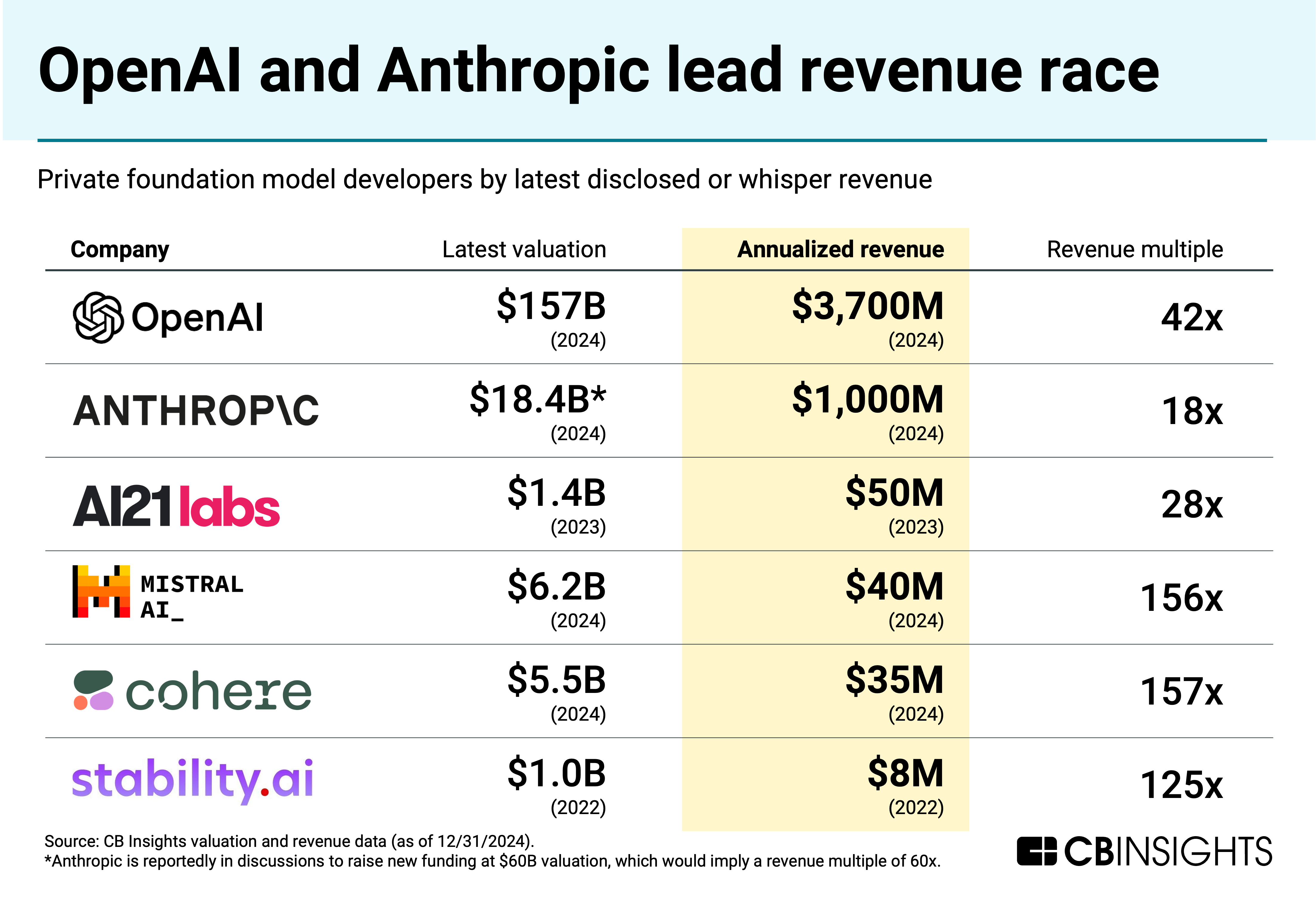 In terms of revenue, OpenAI leads, with projections of $3.7B in annual revenues for 2024 and $11.6B for 2025. However, it’s also been burning cash: the company projected midway through the year that it would lose $5B in 2024.
