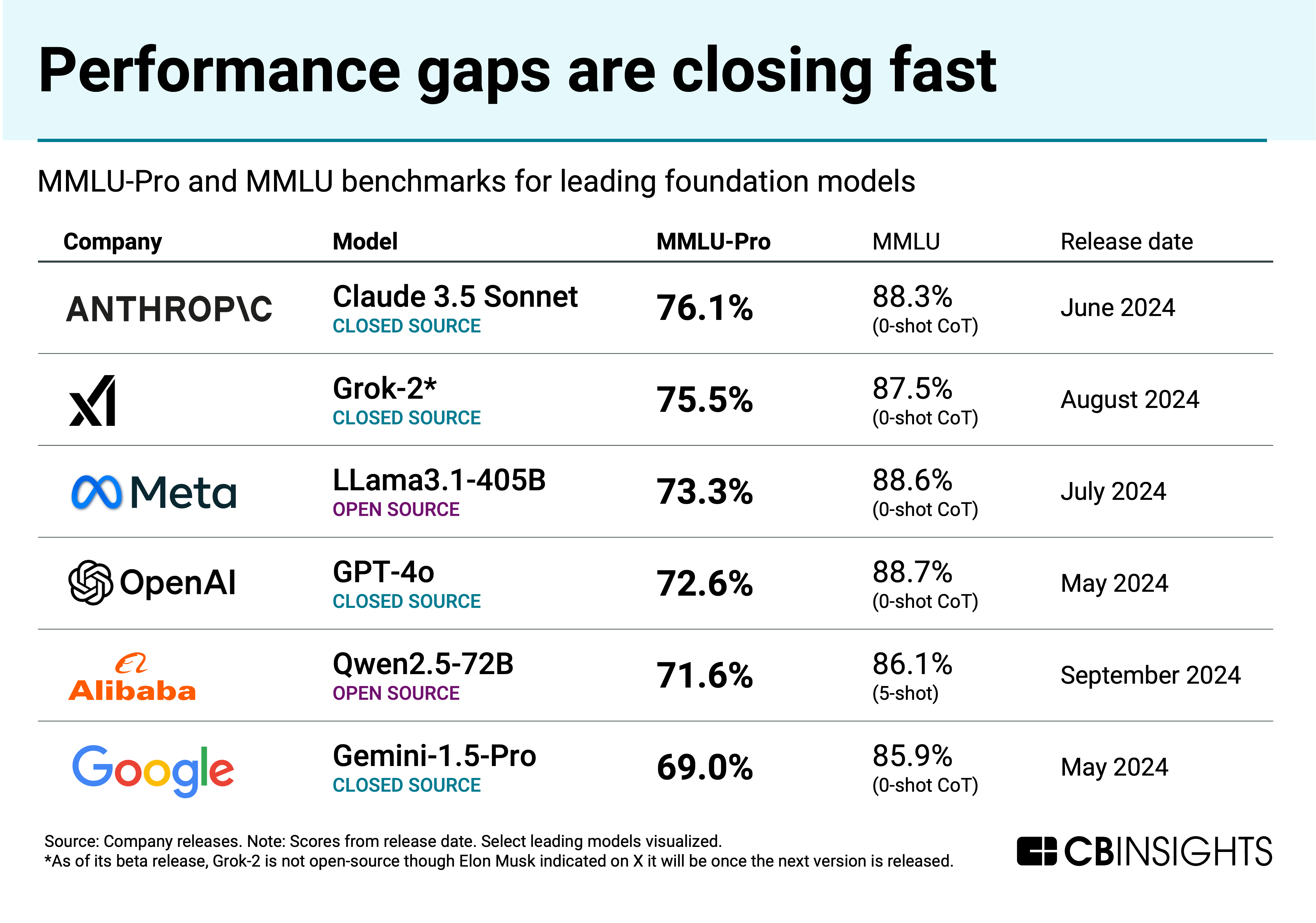 Below, we use CB Insights data to map out the open-source and closed-source AI landscape. Our analysis focuses on foundation models — the powerful, general-purpose AI systems that form a critical infrastructure layer.