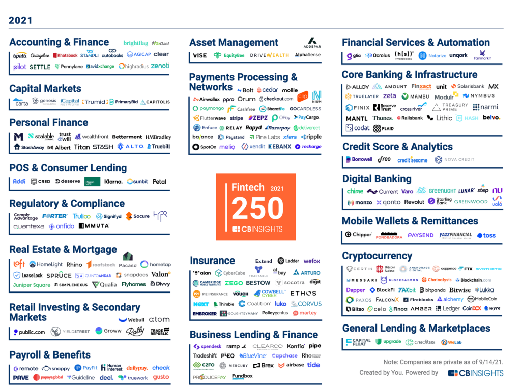 The Fintech 250 is an example of a CB Insights market map, here featuring companies operating in a particular market (fintech) grouped by their area of focus.