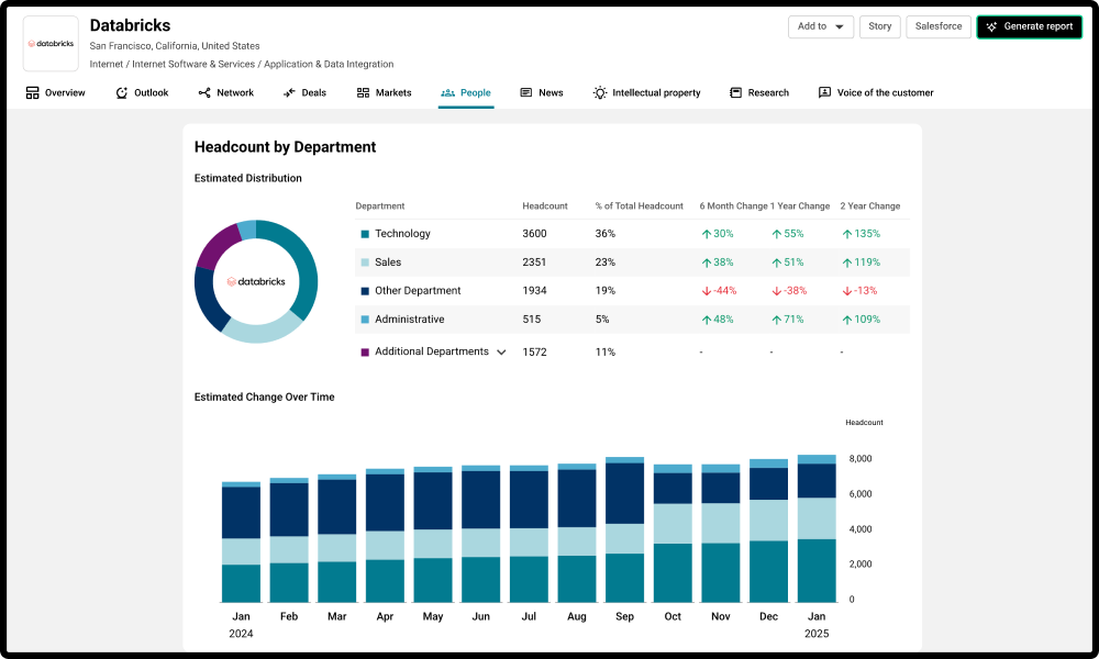 Evaluate and compare company headcounts by department, geographies, and more. Plus, with two years of headcount history, uncover shifts in company strategy.