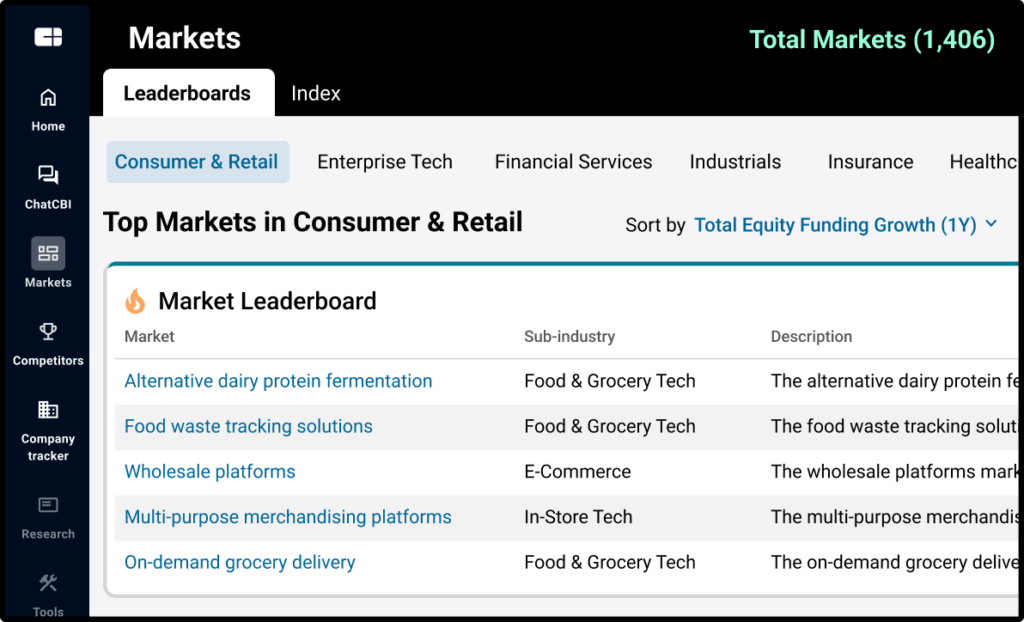 Discover & enter markets faster than ever with the ability to sort and filter through 1,500+ market profiles by size, headcount, funding, proprietary scores like Mosaic and Commercial Maturity, and more.