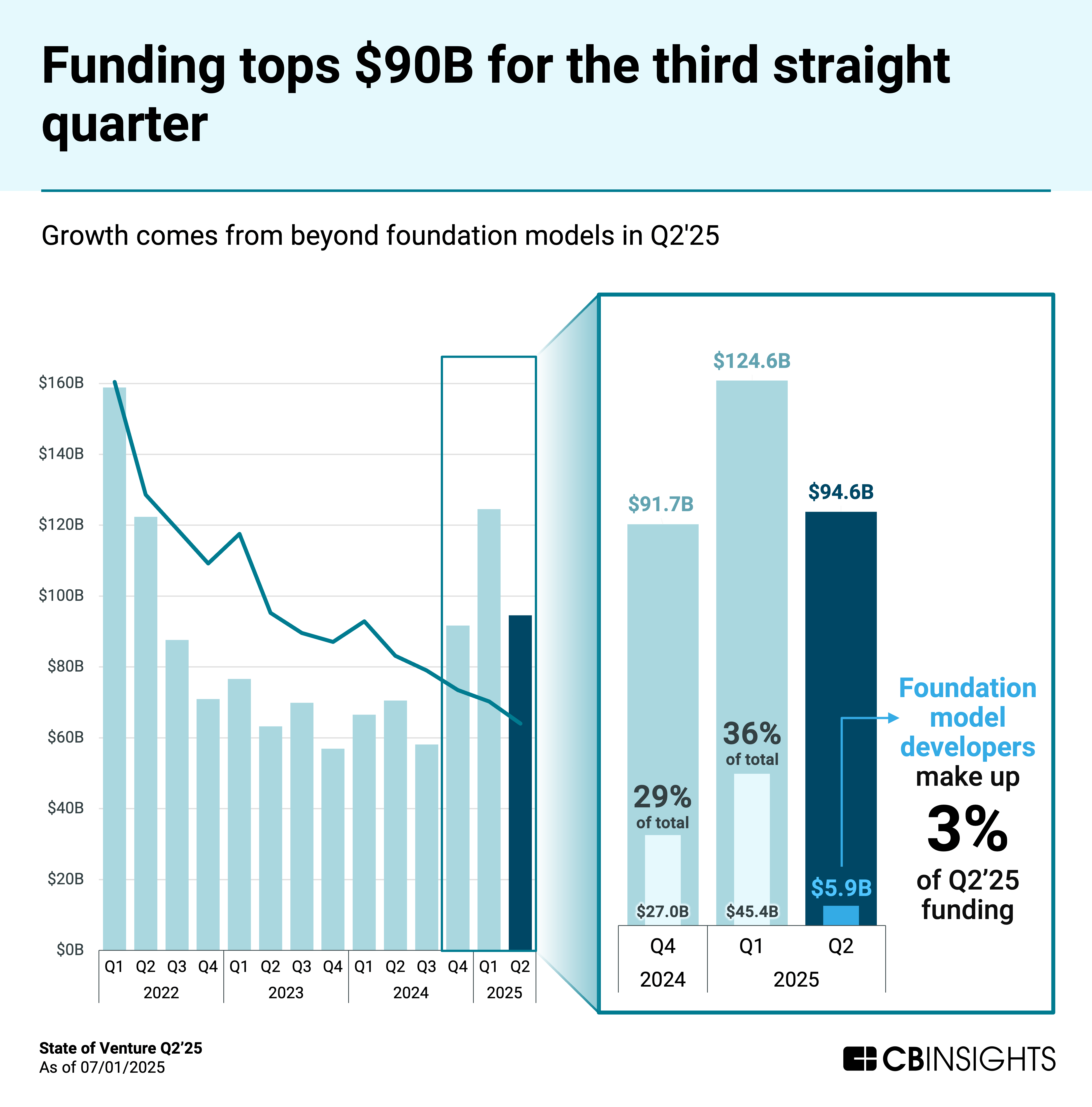 Venture funding reached $94.6B in Q2’25, marking the second-highest quarterly figure since Q2’22 and the third straight quarter to surpass $90B.