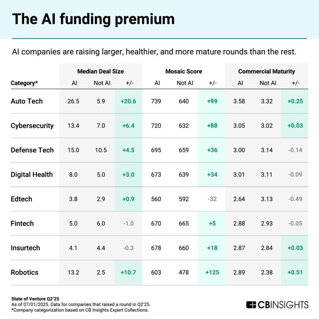 But the premium isn’t just financial. AI companies also score higher on CB Insights’ Mosaic Score (success probability) and Commercial Maturity (ability to compete and partner) across most sectors, signaling stronger fundamentals and market readiness in the eyes of investors.