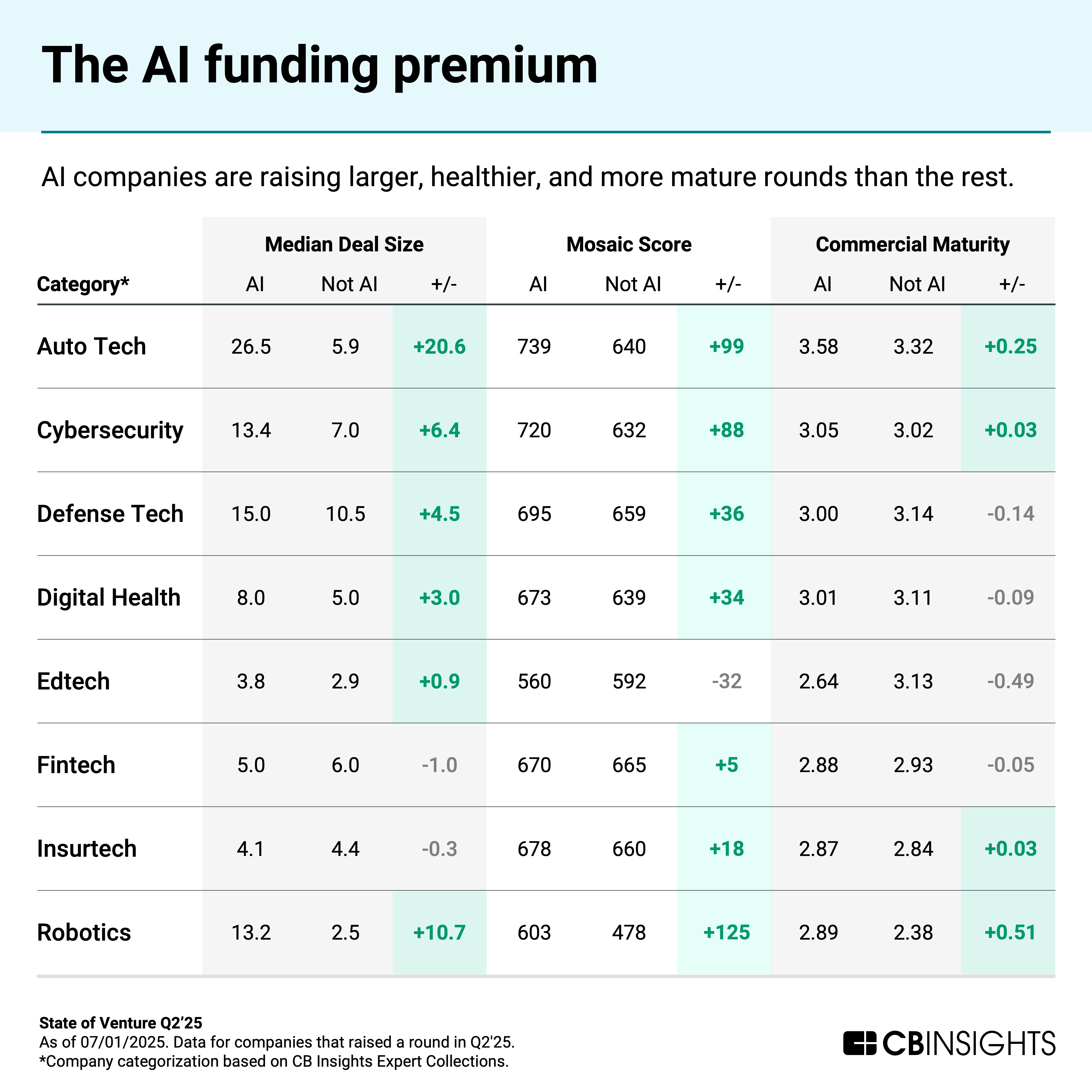 AI companies in auto tech — with most focused on autonomous driving — are commanding the highest premium. Their median deal size is $20.6M higher than non-AI auto tech peers, and their average Mosaic score is 99 points greater. This quarter, the largest AI auto tech deal went to Applied Intuition, which raised a $600M Series F round at a $15B valuation.