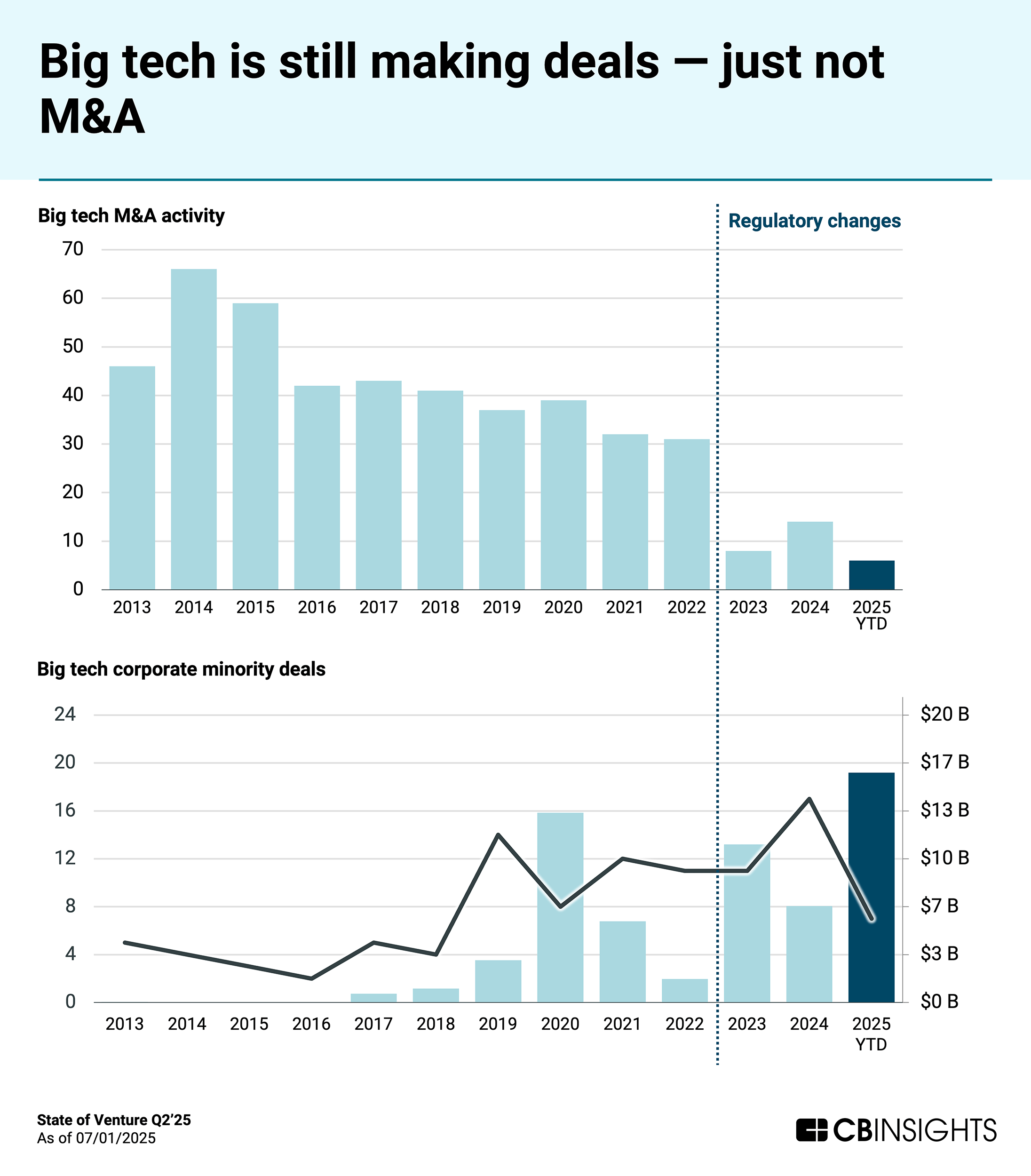 In 2025 YTD, big tech is on pace for 14 corporate minority deals, an increase from levels before the regulatory shift.
