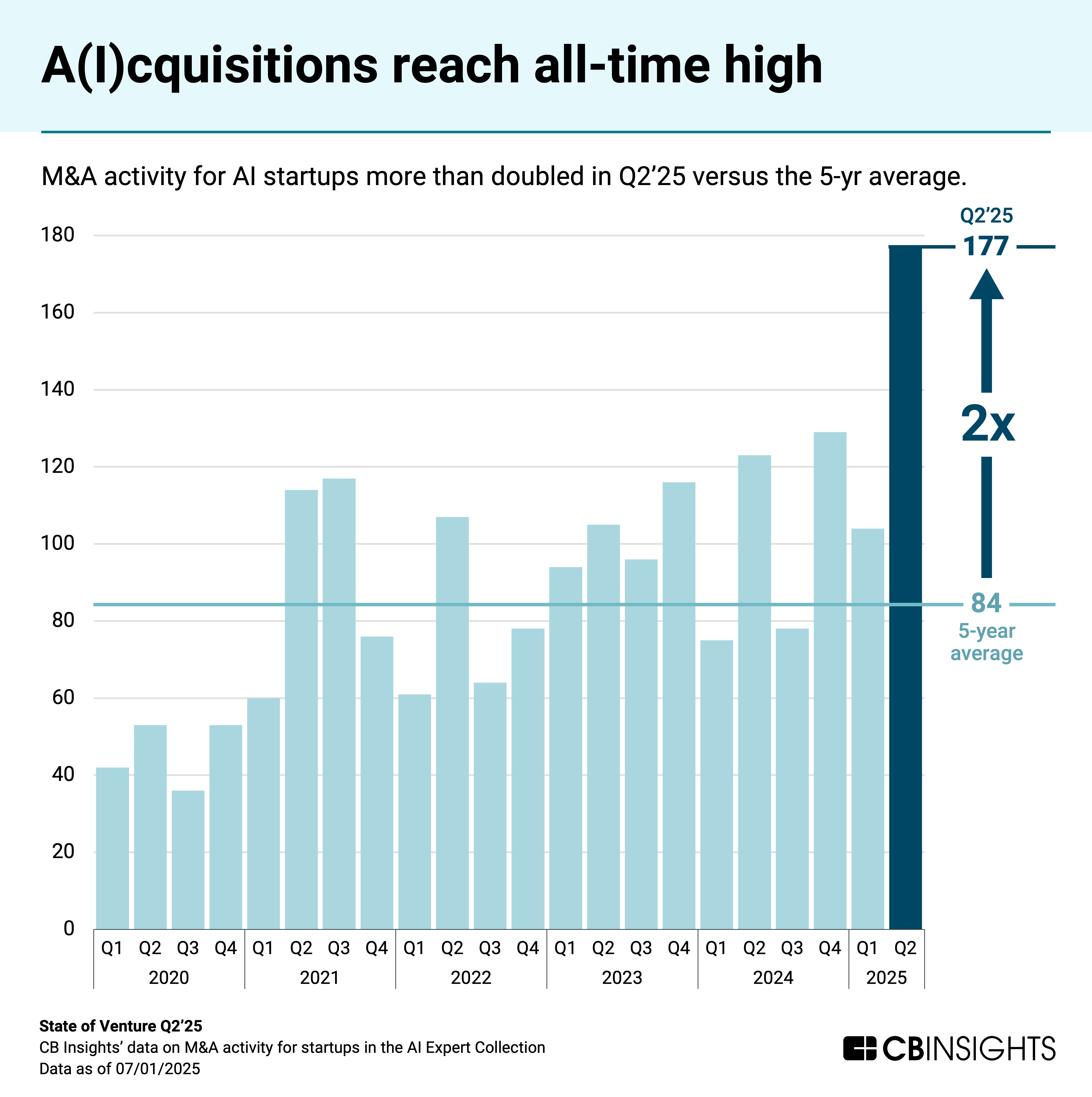 However, acquisitions of AI companies is one area where M&A is increasing. Activity reached record levels in Q2’25 at 177 deals — over double the 5-year quarterly average of 84 deals. This surge reflects companies’ need to acquire AI capabilities quickly rather than build them internally, as AI becomes essential for staying competitive.