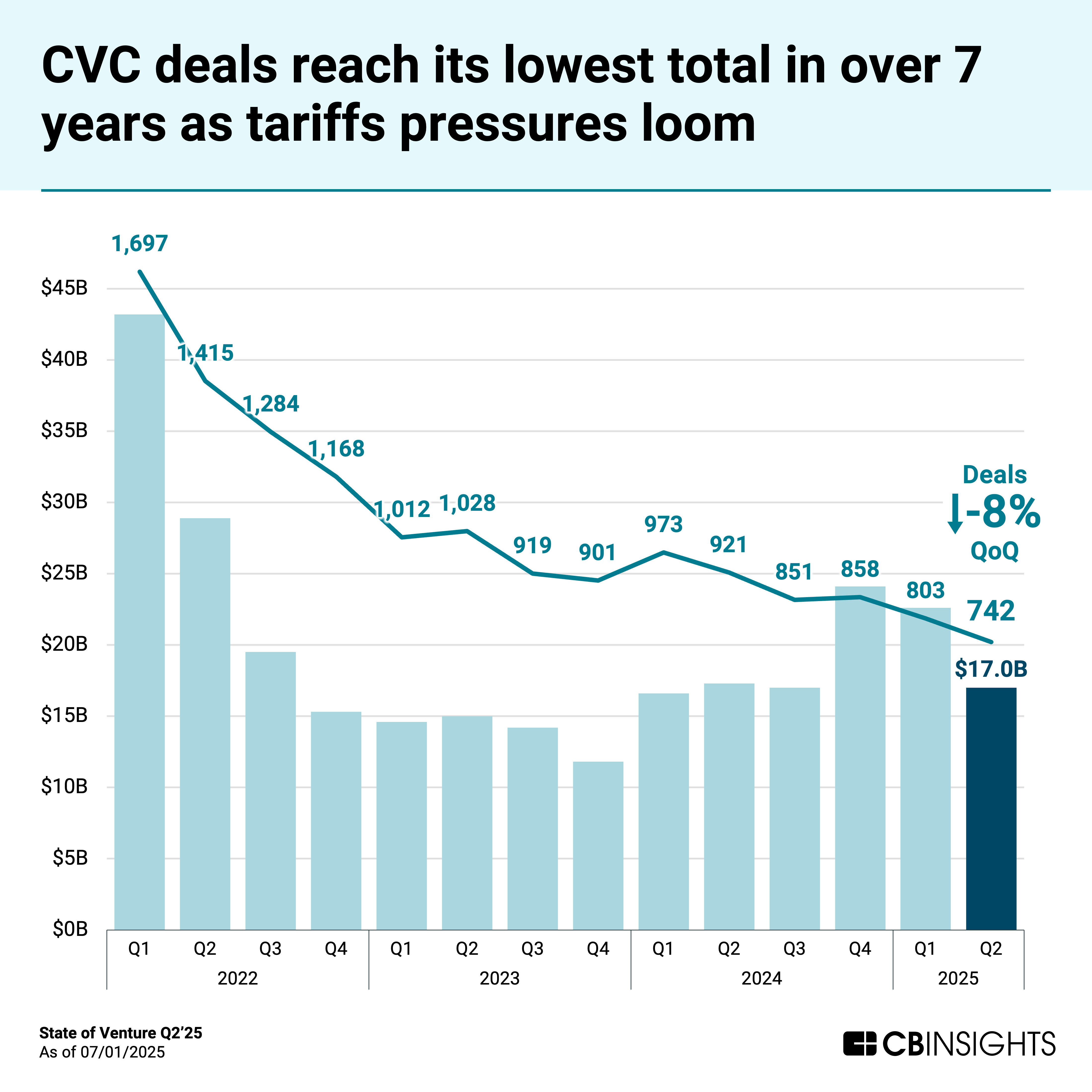 CVC activity has fallen dramatically from its Q1’22 peak due to broader market pressures, including high interest rates and economic uncertainty. Tariff concerns are likely adding further burden to an already weakened market.
