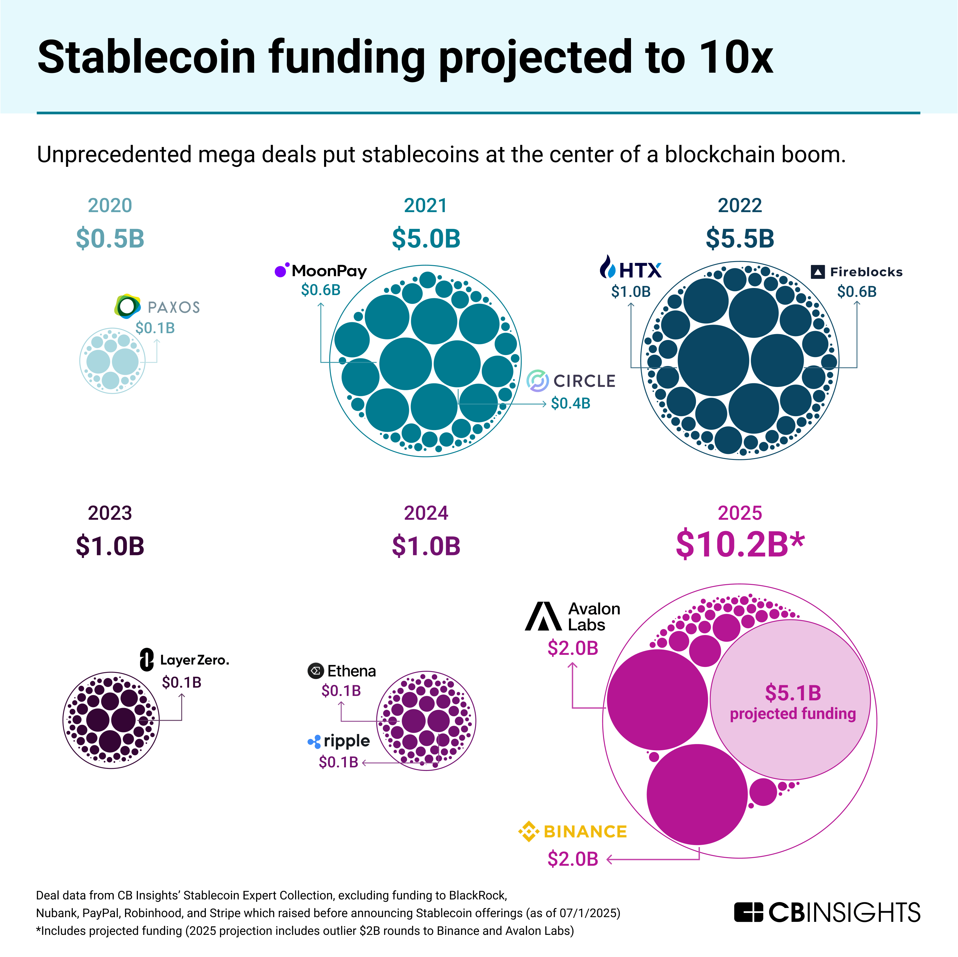 Stablecoin startups are experiencing an explosive year-over-year funding surge as stablecoins achieve mainstream adoption. Funding is projected to reach $10.2B in 2025, representing more than 10x growth from 2024.