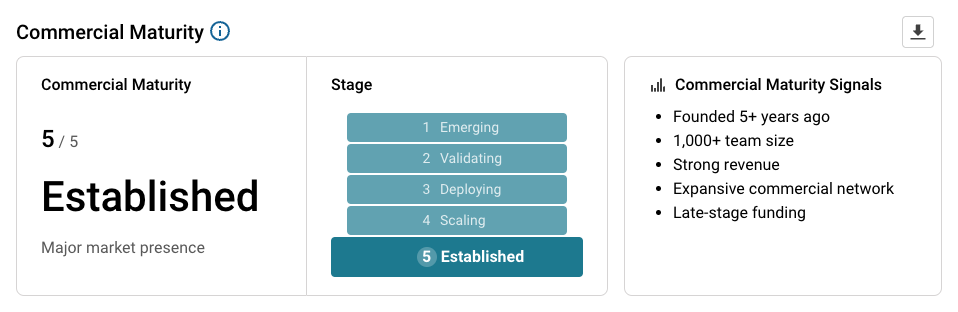 Commercial Maturity is a CB Insights proprietary metric. It measures a private company’s current ability to compete for customers or serve as a partner. Ranging from 1 to 5, it provides a clear, quantitative measurement for where a company lies in its development and growth process.