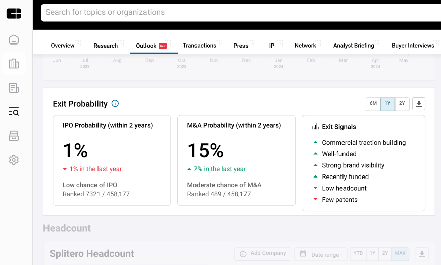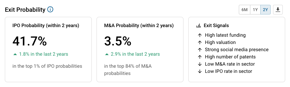 Users can choose to see how a company’s Exit Probability has changed in the last 6 months, 1 year, and 2 years.